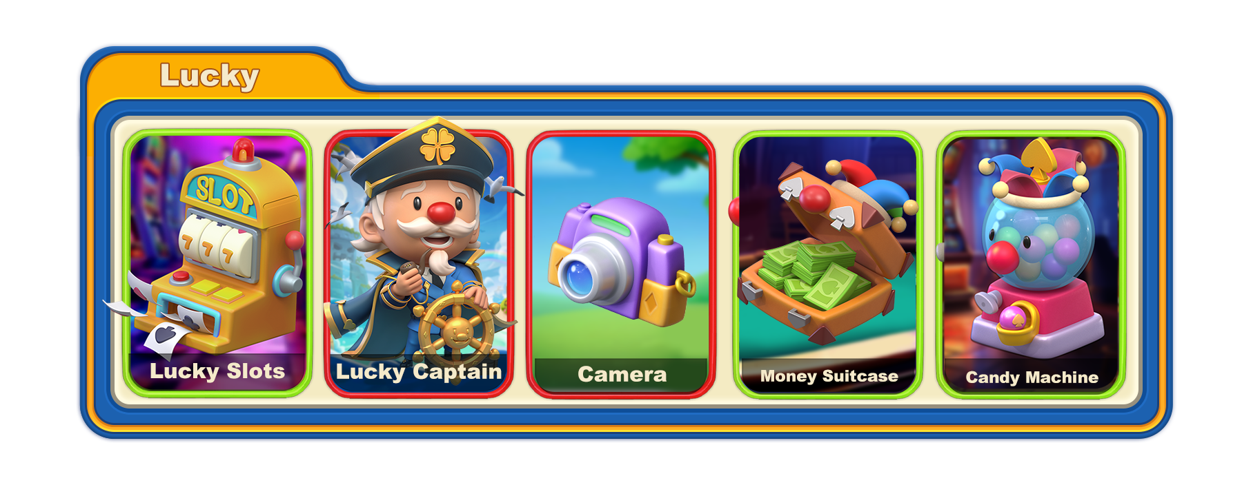 Recommended lineup: Lucky Slots+Lucky Captain+Camera+Money Suitcase+Candy Machine