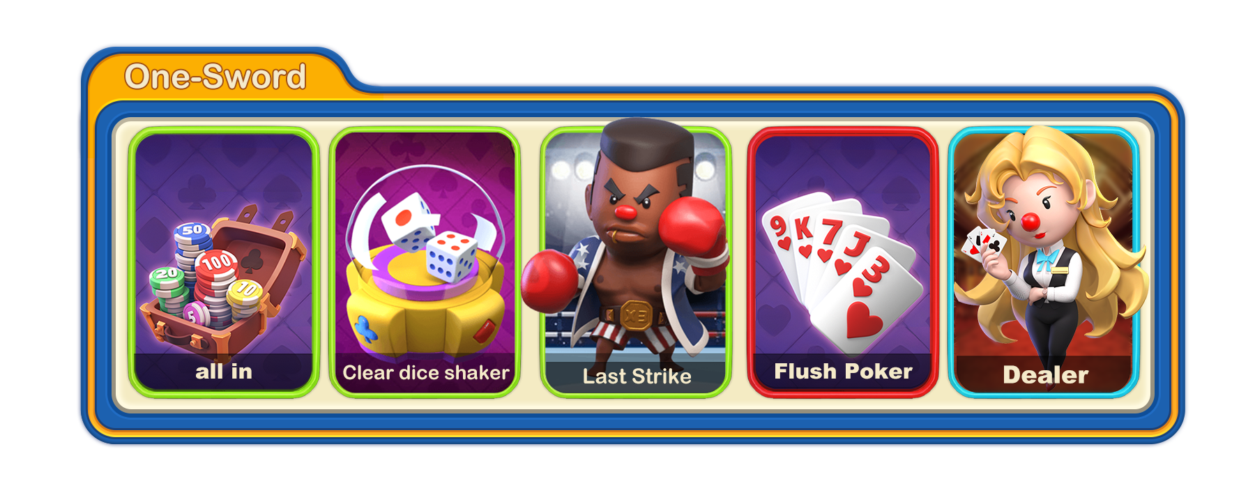 Recommended lineup: all in+Clear dice shaker+Last Strike+Flush Poker+Dealer